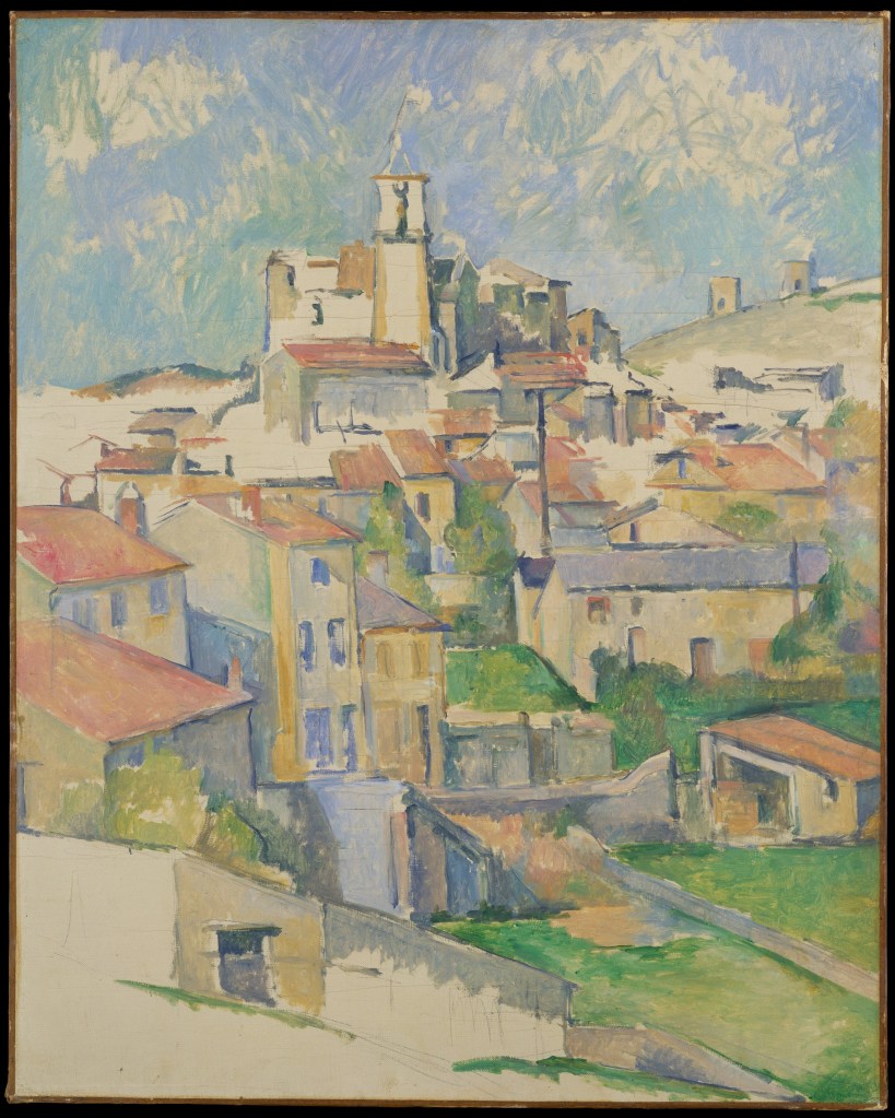 There are three paintings of the village of the hill top village of Gardanne all painted between 1885-1886. This image, also in the Met, demonstrates just how Cezanne began playing with line, volume and the faceting of geometric shapes, and as the museum entry states, this view of the village of Gardanne fully anticipates the Cubism invented by Picasso and Braques in 1908.