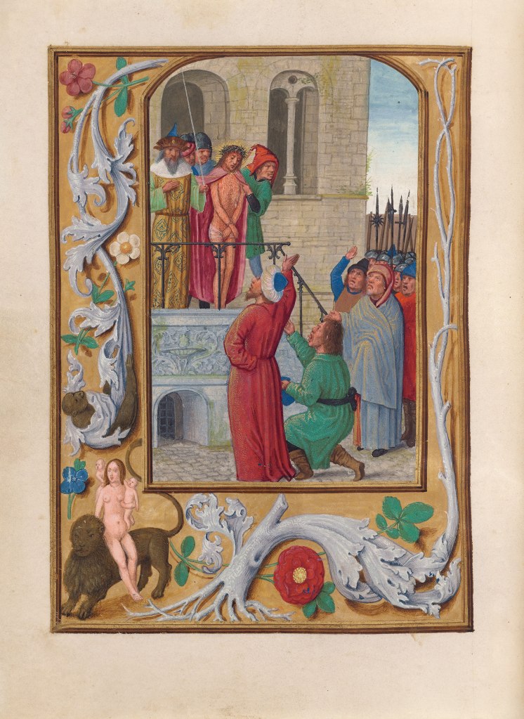 After enduring this beating, Jesus is then presented to the rabble. Forgive me for using Bening images again, but because illuminated books of hours are kept closed the colours are almost as fresh as the day the image was painted.