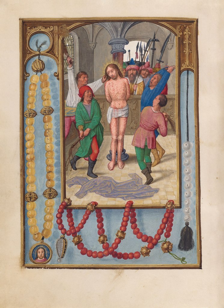 The Bening image (again from the Da Costa Hours) has rosaries decorating the margins of this full page illumination as a reminder to the reader to contemplate why this is happening. A small portrait miniature of Christ hangs from rosary down in the bottom left hand corner of the page. The way this scene is framed and the red rosary threads over the bottom rail of the inner frame it is as if we are looking through a small window and are bearing live witness to this punishment. The robe of imperial purple lies discarded on the floor and soldiers crowd in through the far door to witness the beating with the scourge and the bundles of sharp twigs.