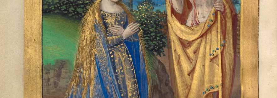 This traditional image of Mary Magdalene comes from a book of hours in the Getty Museum, Los Angeles, created in 1500 for Denise Poncher, the daughter of the Treasurer of Wars for the French king, Louis XII (1462-1515). Because of the many allusions to marriage and motherhood it is thought this devotional book was a wedding gift for Mademoiselle Poncher on the occasion of her marriage to Jean Brosset.