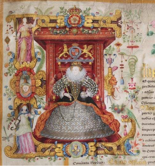 While Teerlinc introduced early Renaissance motifs into document illumination, Hilliard’s later style embraces a combination of late Renaissance motifs together with elements of the queen’s personal symbols representing her as a wise virgin goddess as seen in the illuminated E (below) for the founding charter of Emmanuel College, Cambridge, commissioned by Sir Walter Mildmay in 1584.