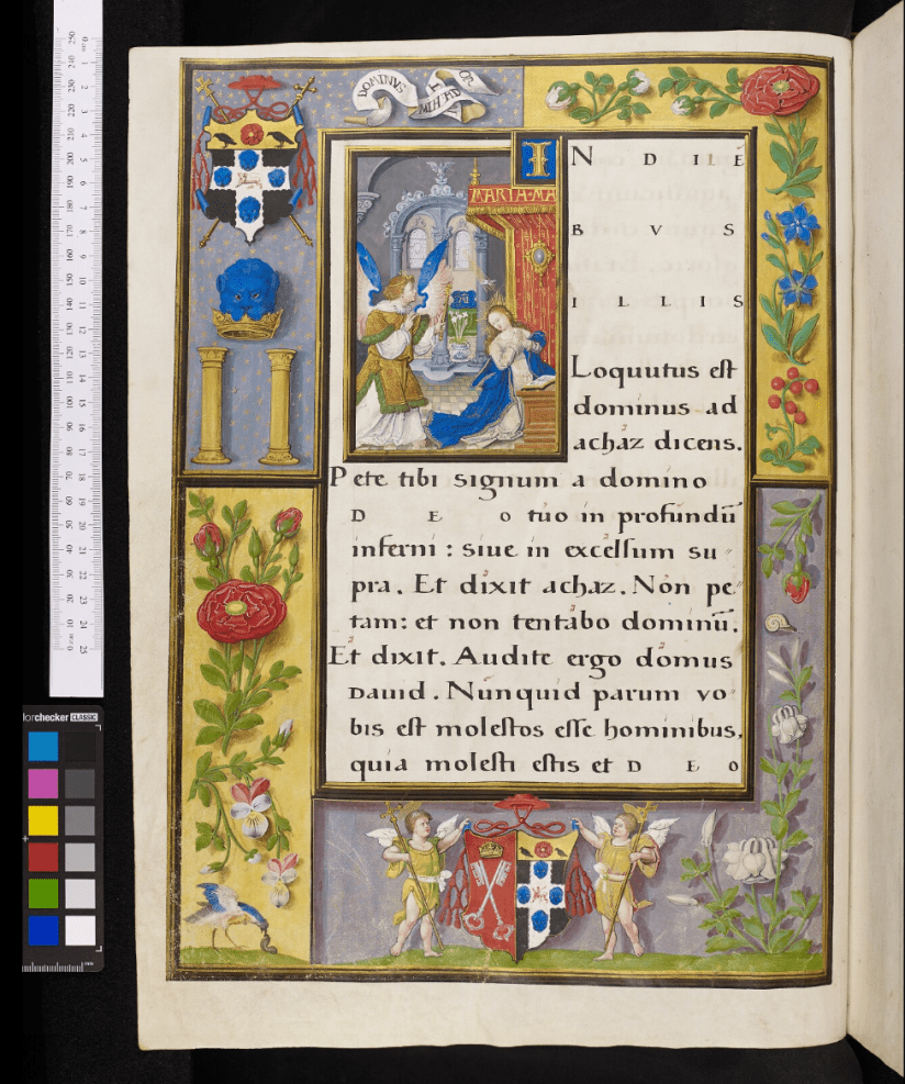 Comparing the illuminated page with The Annunciation in the illumianted capital letter ‘I’ in the Christ Church college 1528 manuscript to the two wood cut images of The Annunciation in the Wren library copy shows how the cardinal is unlikely to have been impressed by a gift of a mass produced book containing standard woodcut images – albeit hand-coloured.